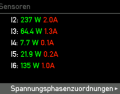 Wählst du im Hauptmenü "Sensoren” aus, kannst du, wenn du ganz nach unten navigierst, die Spannungsphasenzuordnungen ändern. Navigiere zwischen den Zeilen und wähle die Phase, für die du die Zuordnung ändern möchtest, mit der nach rechts Taste aus, um deine falsch angeschlossene/n Phase/n zu korrigieren.
