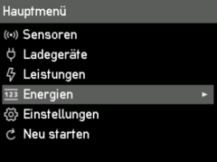 Wählst du im Menüpunkt “Energien” aus, siehst du die aktuelle Energie in Wh für die einzelnen Kategorien.