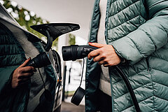 5. Jos latausasemaan on liitetty latauskaapeli, liitä se suoraan sähköautoosi. Jos näin ei ole, liitä oma kaapelisi latausasemaan ja sitten autoosi.